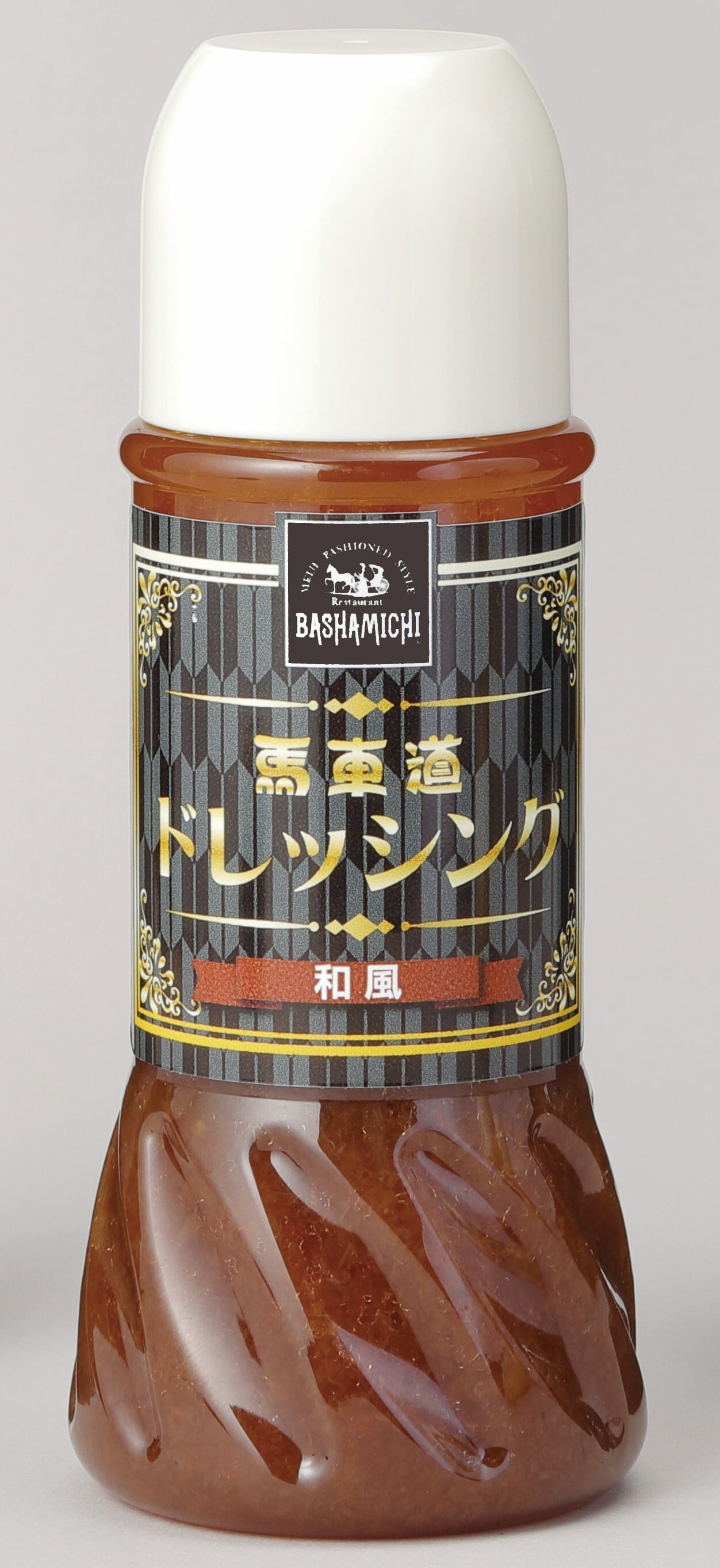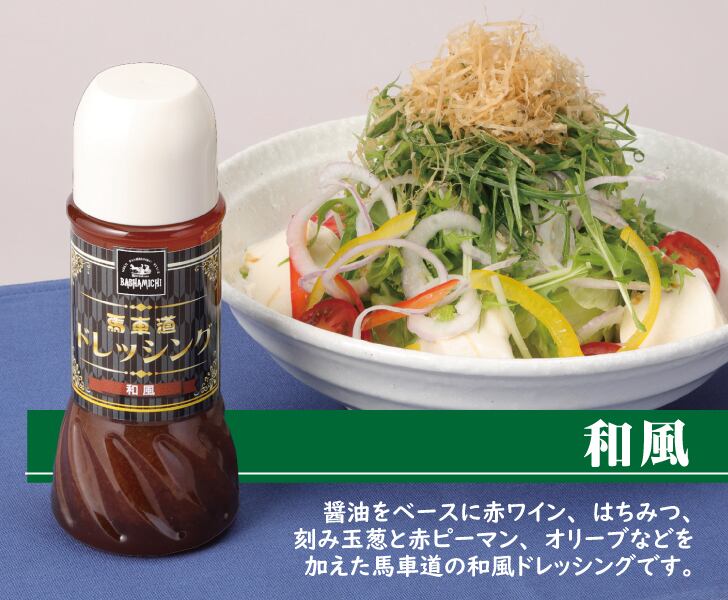 醤油をベースに赤ワイン、はちみつ、刻み玉葱と赤ピーマン、オリーブなどを加えた馬車道の和風ドレッシングです。